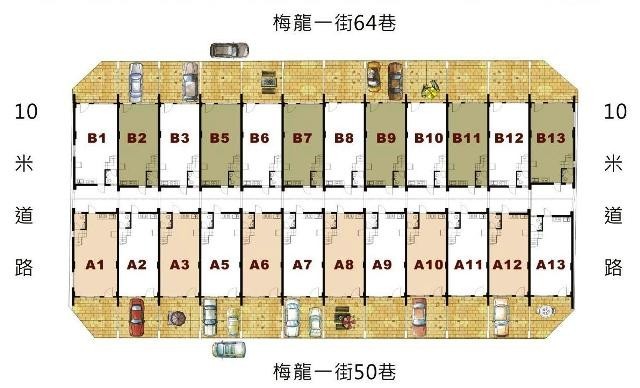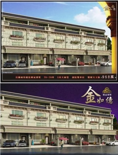 金如億總基地為634坪,戶數為24戶。為A、B兩連棟式的別墅。其中,A1、A13、B1、B13四個邊間的坪數為75-78坪,其他則為70坪。平均每坪13.6萬起,總價958萬到1168萬。邊間坪數.面寬較大加上又是邊間、因基地四面臨路,而且路寬有8-10米,進出動線極佳,所以也可以當店面,用住家價格在金如億可以買到透天店面,亦可當住辦兩用的透天別墅。且稀有一戶一建照,產權完全獨立,是龍潭地區少見的超值美墅。