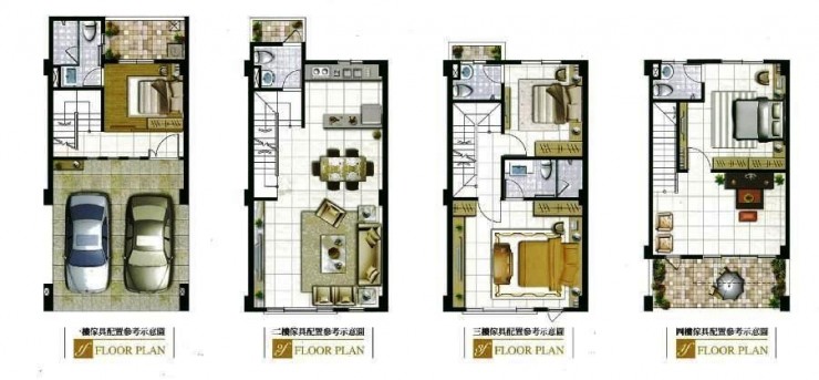 如下圖,70坪的室內面寬有9米寬。其隔局為1樓可停放2部車空間的停車場及一間房間及一套衛浴設備。2樓則為主客、餐廳及廚房。3樓為2間房間(1間主臥房)、2套衛浴。4樓則有一間房間。