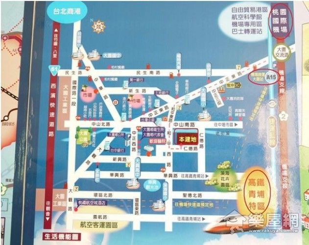 ↑↑↑交通圖:行雲的右上方為機場捷運線A15站,再過去則為桃園國際機場。右下方為高鐵青埔特區。沿著中正東路開能通達大園交流道,不論出國、往北部都極為便捷。