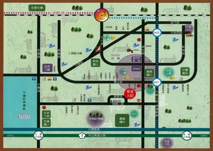 如下圖,華夏大院位於中壢市的華夏路上。左邊有中壢科學園區、右上方為SOGO商圈,而距離不遠的機場捷運線A21也在隔一條路的中豐北路上。華夏大院所處的華夏路為南園二路上進來的分支小路。基於此,華夏大院避免了大馬路上車水馬龍的車輛噪音,有著更佳的生活品質。既使要出門購物也不用擔心,出去的西園二路再往新生路上去則為SOGO商圈。若往下則為內壢交流道。