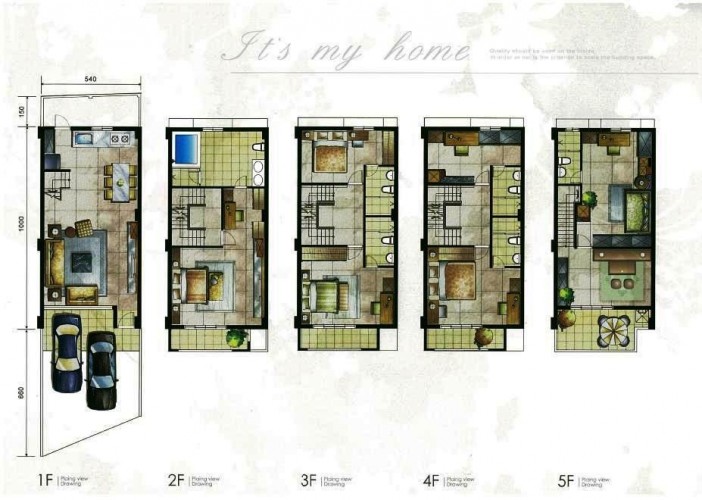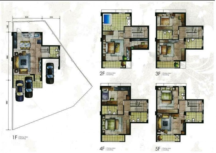 華夏大院總基地為102坪,為地上5層建築。總戶數共3戶。雖然總基地面積不算大,但五層樓的建坪室內空間高達97~102坪,有相當充裕的使用坪數。如下圖所示,這間為三戶中的最右側戶,其地坪就有41坪、建坪102坪。室內共有7房、8套衛浴設備。其1樓可停放三輛車,從停車場進來為面寬八米的客廳、後方的開放式廚房及廁所。二樓進來則為一大間的主臥房,三樓有2房間及各自的衛浴設備、四樓亦有2房間及2衛浴、五樓則同三、四樓也有2房2衛浴。