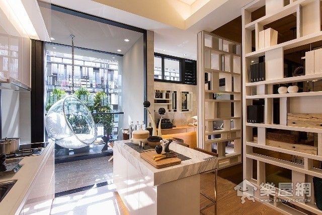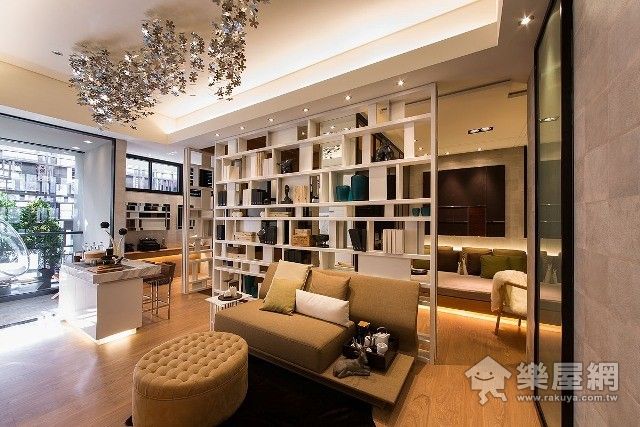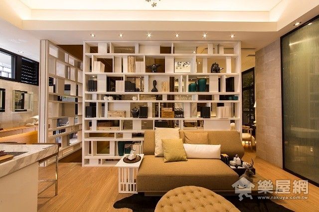 巧妙的運用穿透式的書架當作隔間,把客廳、餐廳、廚房跟二個臥房隔間開來不突兀。