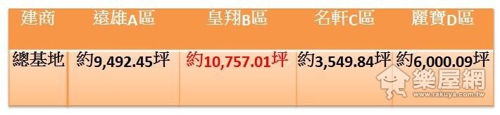 以皇翔的10,757.01坪最大,再來為遠雄、麗寶及名軒。