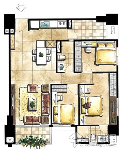 A7戶與上面的A5戶同樣均是三房二廳雙衛浴的隔間。但這間多了1.5坪的小玄關空間。