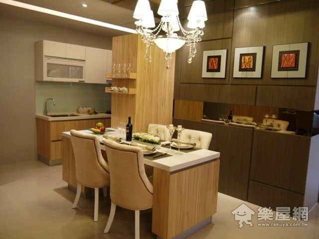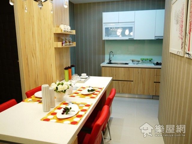 開放式的廚房與餐廳呈L型動線,烹調好的美食即可熱騰騰地上菜囉!擺放菜餚的精美中島吧台,還有烹飪使用電鍋、微波爐的電器櫃都不必花費購置,因為這些都是標準配備。