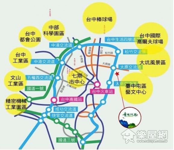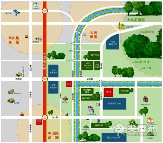 ↑↑↑青境悅來享有便捷機能,區域內三大生活圈 : 大坑生活圈、太原/東山路生活圈、屯區藝文中心、太平中山生活圈,賣場、市集、機關、教育機構、大型活動設施、醫療機構等一應俱全。
