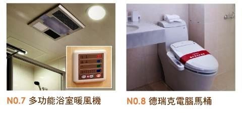媲美豪宅級的青境悅來,附送多功能浴室暖風機,其送風、抽風、負離子殺菌、定時、暖風延遲、暖風、外接式照明、照明等八合一功能,全年享受舒適的浴室環境。除外,馬桶採用台灣在地專業衛浴設備的Derek 德瑞克,是國內唯一與西德技術合作的高級電腦馬桶。