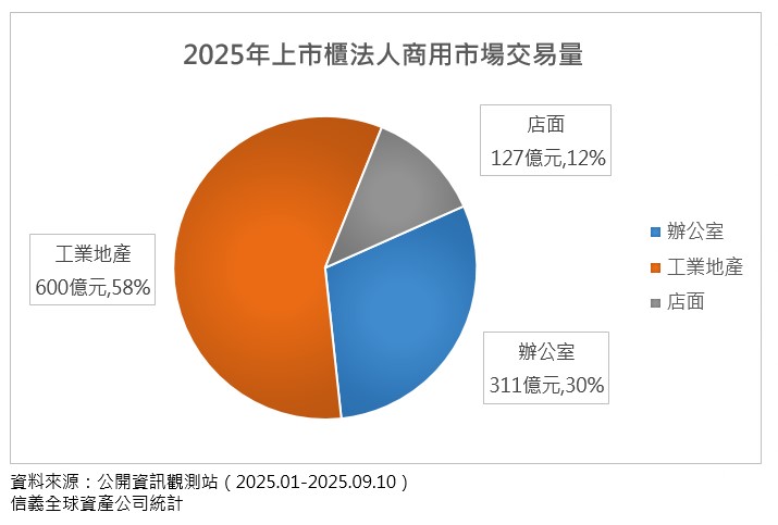 據信義全球資產公司統計,截至9月10日止,上市櫃法人商用不動產累計交易量達1038億元。工業地產交易最熱絡,累計交易量達600億元、佔58%;辦公室交易受企業資金運用保守等因素影響,交易量雖未衝高,但在產業升級、舊換新需求趨動下,新大樓交易表現亮眼,交易量為311億元、佔30%;商場、店面受惠於壽險、REITs等買盤進場,交易量達127億元、佔12%。