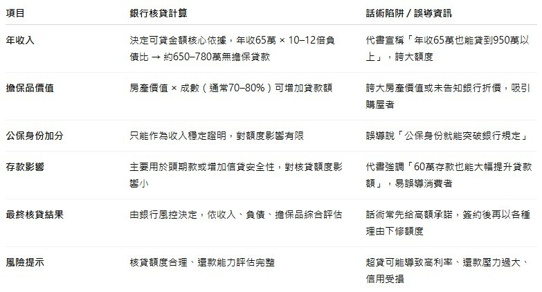 「年收入×負債比(通常10-12倍)+擔保品價值×成數」。以年收65萬計算,無擔保貸款部分最高約780萬,加上房產價值評估,總額較難達到950萬水準。