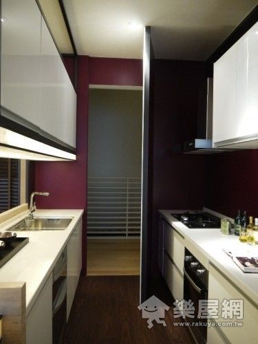 ↑長型的廚房,便利貼心的設計,後方是通往陽台的門。