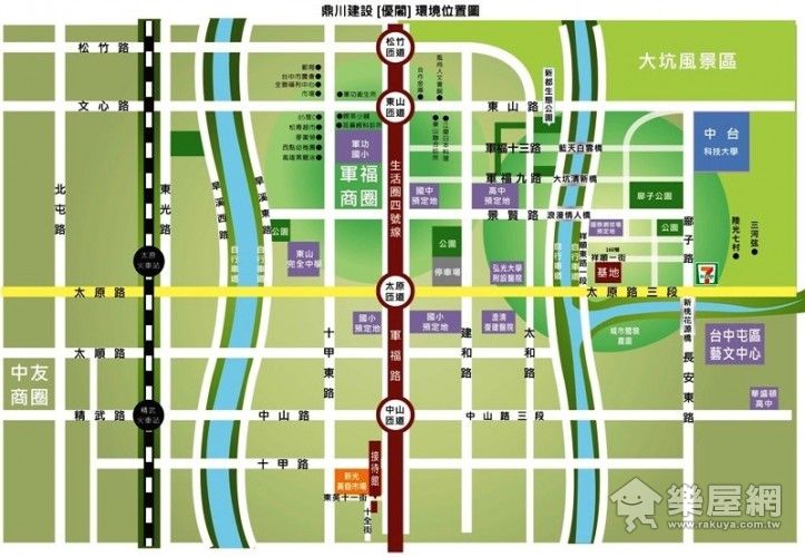 ↑ 鄰近有中台科技大學、軍功國小、東山完全中學、美國林肯學校…就學方便。
