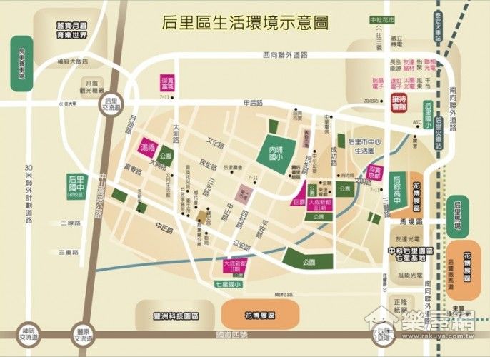 目前,后里地區主要生活圈大致分成兩區,一個是以消費生活為主的上后里商圈、另一個則是以公務行政為主的內埔商圈。巨鼎所在位址則是靠近內埔商圈,但通往上后里的交通也是相當便利;因為這裡不但擁有大城新都三期的八米聯外道路、另一邊則是通往全聯的三米道路,雙出入口交通非常便利。走路到全聯、銀行、農會、國小、市場…都只要3-5分鐘的時間,生活機能已經相當完整。