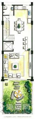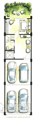 ↑ 一樓規劃前院為車庫,後面則是孝親房與後院。二樓是客餐廳的設計,還有一個超大的前院陽台。