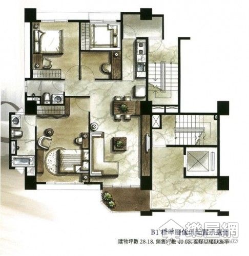 ↑ B1標準層平面圖,建物坪數28.18坪,三房兩廳規劃設計。