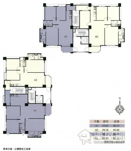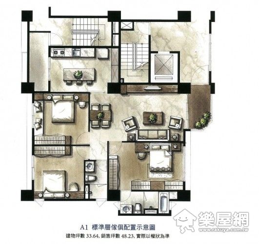 ↑ A1標準層平面圖,建物坪數33.64坪,三房兩廳規劃設計。