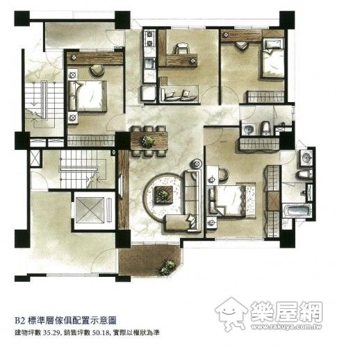 ↑ B2標準層平面圖,建物坪數35.29坪,三房兩廳規劃設計。