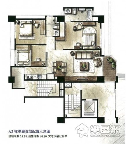 ↑ A2標準層平面圖,建物坪數28.18坪,三房兩廳規劃設計。