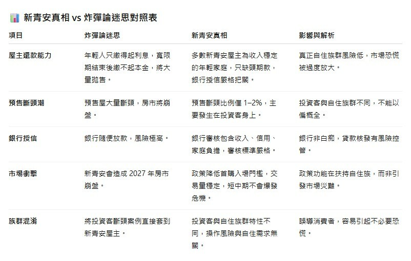 相比之下,新青安貸款人多為自住需求,全家心力都投入在唯一房產上,兩者的動機與風險承受度天差地遠。將投資客的資金調度問題硬套到自住客身上,這種族群混淆的論點在實際市場參與者眼中顯得格外荒謬。