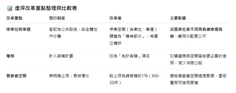 虛坪改革主要鎖定三大目標:停車位計價方式、電梯容積計算、管委會空間規範。現行制度下,停車位與車道面積登記為公共設施,由全體住戶分攤,導致不開車的住戶也得為車道買單;改革後則將停車空間調整為「專有部分」,有獨立權狀,實現「誰使用誰付費」的公平原則。