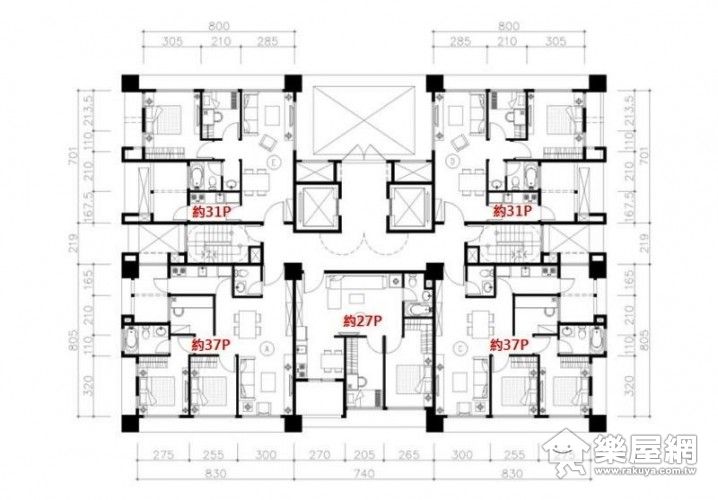 ↑ 大樓平面圖,面河景三戶坪數大約為37坪、27坪、37坪;面公園的兩戶則是大約都是31坪,大約都是2-3房的設計規劃。
