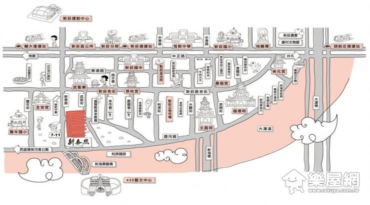 從捷運新莊站出來,一個轉角就可以走進擁有兩百多年歷史的新莊老街,街道巷弄間古廟、老屋、舊巷與現代建築雜處,沿途經過的廣福宮、文昌祠、慈祐宮、武聖廟都已經被列為文化歷史古蹟,空氣中時而飄來一股輕新的香味,看著街廓中熱鬧來往的人潮,傳統與現代交疊的畫面,不禁讓小編想起北港朝天宮、鹿港天后宮、大甲媽祖廟…那種香火鼎盛、充滿濃濃人情味的地方,當然還有很多吃不完的美味傳統美食~~不過,今天來到新莊可不是為了逛老街,而是要帶大家來看看位在新莊老街與大漢溪水岸間的新建案「新泰然」啦!