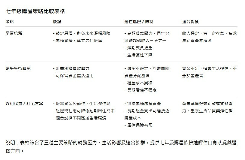 以「以租代買」的模式結合社會住宅或長租公寓,提供相對穩定的居住條件,並保留流動性與資金彈性。專家建議,七年級世代在考量購屋策略時,不應只看房價漲跌,也要兼顧生活質量與財務安全。