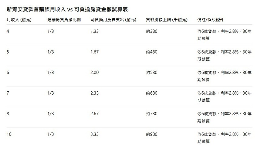 以台北市一戶總價1,000萬元的兩房小宅為例,若採新青安貸款六成、利率2.8%計算,30年期貸款月付金約3.5萬元,但若加上房屋稅、地價稅、管理費以及水電雜支,每月總支出可達4.5萬元以上。對月薪僅5萬元的首購族而言,房貸支出已佔收入九成,顯然超過「房地支出不超過收入1/3」的理財安全範圍。
