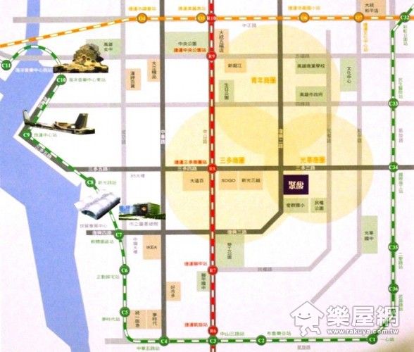 ↑周邊生活機能、商圈交通等相對位置,紅/橘線是高雄捷運、綠線是輕軌路線,可見「聚馥」的位置奇佳,是購屋者最喜愛的好地段!