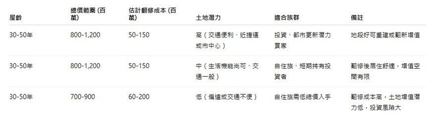 若地點佳、交通便利,且土地面積足夠,未來都市更新或重建潛力大,購買老屋也可能成為長期增值標的。專家建議,買方除了看總價,更應關注「土地價值、地段優勢與翻修後潛力」,而非單純以屋齡或成交價作判斷。