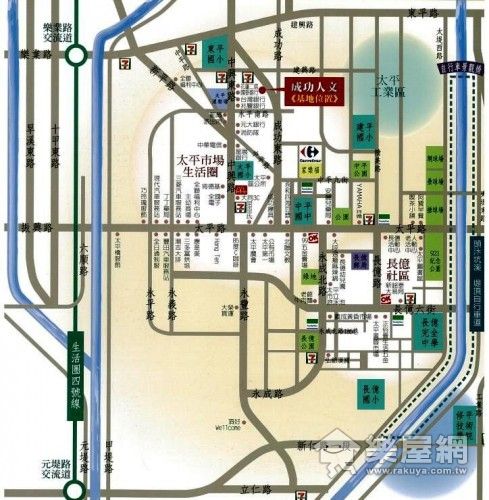 ▲建案就位在太平成功東路上,出門往左就是太平熱鬧的家樂福商圈,往右則是有全聯、7-11、全家…等小型的商場。