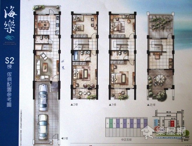 「海樂」是僅12戶組成的雙車庫三樓半高透天厝,雖然面向西邊,但由於大廳門宅做得夠深,各樓層另有做陽台,並大器地採取大片門窗方式,讓屋宅光線充足,卻不怕有西曬的問題。深度達25米的一樓,可於後方另做隔間成為孝親房,讓雙親不再擔憂膝蓋老化的問題;前方的車庫則能停進兩輛轎車,符合現代人對於工作學習上的交通需求問題。根據調查,全台的小康家庭至少有2輛機車和2輛汽車為全家人使用。全棟以五房規格為主,前方鄰8米路;後方棟距至少有1.5米,省去出入動線或安全問題的疑慮。而頂樓的天台則是廣大的曬衣空間或者休閒場所,站在樓頂往海的方向望去,夕照映入眼簾,美不勝收。