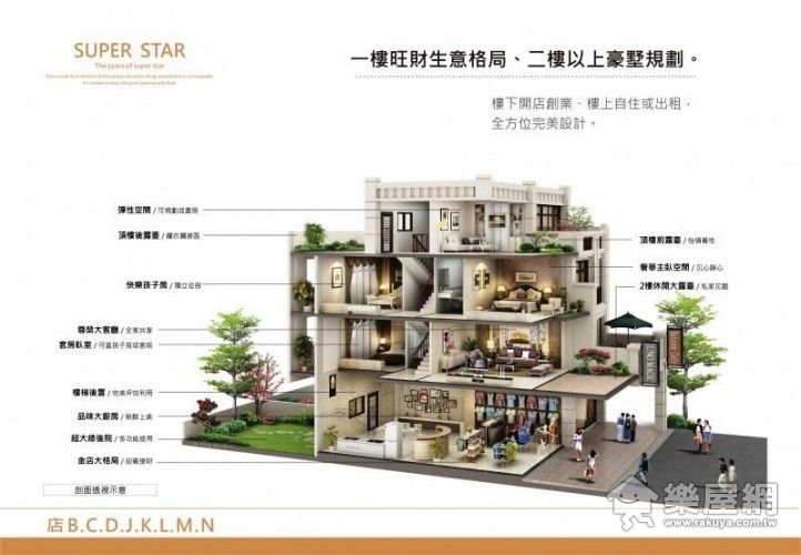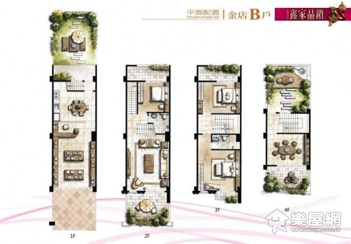 ▲B戶各樓層配置參考圖,一樓店面、二樓則為客廳與臥室、三樓則是兩間臥室、四樓則為陽台與神明廳…等空間。