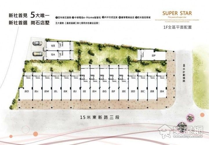 ▲「鑫家晶鑽」一樓全區平面圖,面東新路三段的15戶、再加上右側的1戶,全部都是店住合一的透天厝,後面2戶則是單純的住宅別墅!