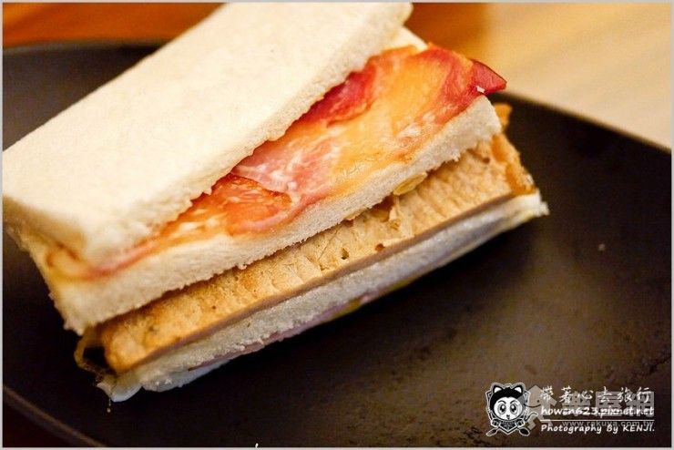 ▲超綿大三元總匯蛋土司 NT70元。裡頭內容有:火腿+培根+排肉+蛋+四片土司。