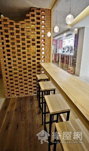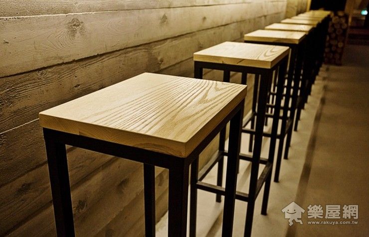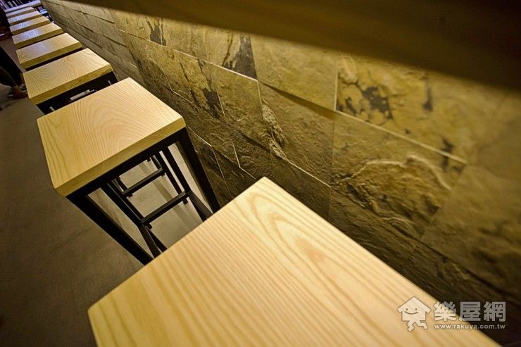 在這樣一個單純的商業空間中,到處都是令人感動的設計,這個看似簡單的吧檯外部設計,設計師為了呈現出木紋磚的立體錯開表面,不斷去尋找適合的材料、自己做板模的架設、甚至是歷經好幾次的灌漿挫敗,才成就了這個特殊的清水木紋表面。而吧檯檯面設計師則是使用了栓木,經過風化處理後的立體山型紋理,更加具有質感,顏色也銜接的更自然。店內所有高腳椅、方桌及長桌,從木材的挑選、裁切、表面處理,全都是設計師親手打造出來的。