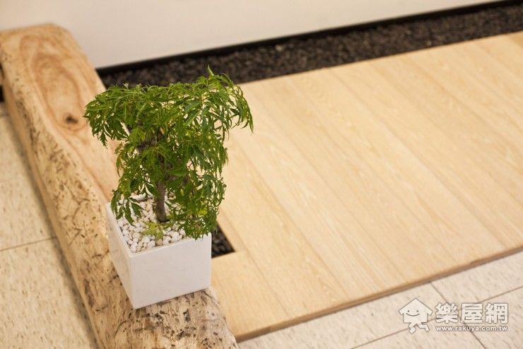 ▲玄關盡頭的小端景,風化台灣樟木搭配上小小的綠色盆栽,讓心情在此轉折,爾後進入辦公室。