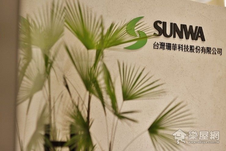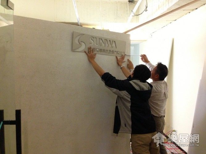 不規則紋理的米白特殊漆牆面,低調襯出公司品牌形象,