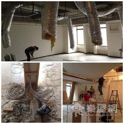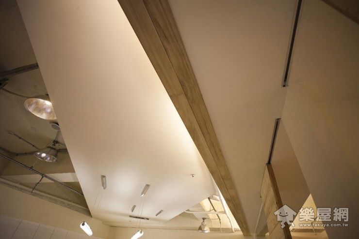 ▲天花板拆除後,設計師規劃了局部木作天花板擋住了最雜亂的地方,而這片木作天花板也正好位在辦公區的正上方,恰巧可以懸掛辦公照明燈管。