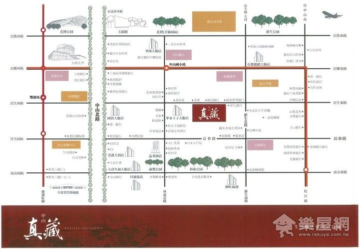 「中山真藏」鬧區靜巷,下樓有林森公園,散步逛欣欣秀泰影城,新光三越、美術館、藝術館也近在咫尺,逛街採買絕對便利;捷運中山國小站、雙連站中點,暢遊大台北,直達台北車站。並與五星飯店為鄰,大倉久和、晶華、國賓、老爺國際酒店均選擇本區落腳,足以證明本區的發展優勢