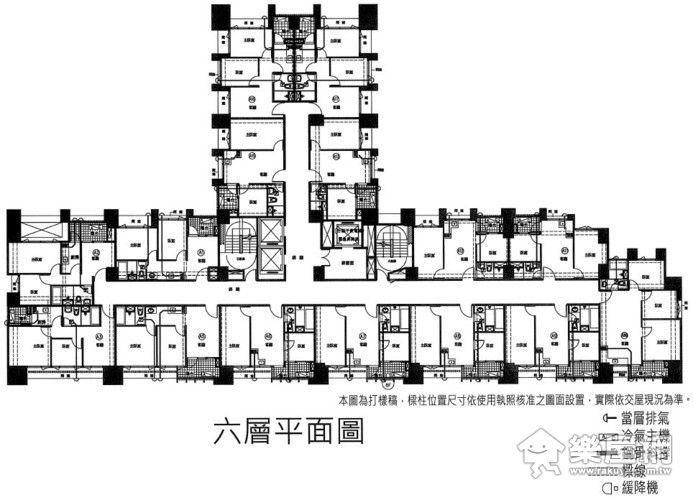 ▲ 六層平面圖:倒T型建築,中間為三座大電梯。