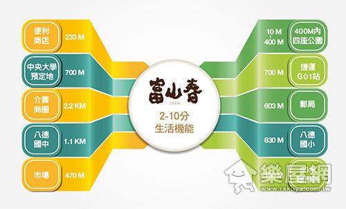 【富山春】基地位於八德重劃區核心地段,區域生活機能便利,300米鄰行政園區預定地,八德區公所及戶政等行政機關未來將遷移到此,可謂「八德中央特區」。區域學區為八德國小、八德國中,加上50米幹道興豐路、建德路口的綠地,將成為中央大學八德分校,境內完整學制豐富學園,盡享文風薈萃。