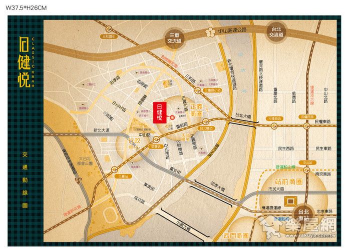 日健悅建案位處於三重正義商圈,緊臨著正義國小,無論購物、就學都非常地方便,尤其在交通上更是如此;基本上,住戶自行開車從正義北路轉重新路,再上台北橋就可以通往台北市區;或是選擇上新北環快也可以串接台北各大生活圈。如果住戶選擇搭捷運的話,步行約650公尺就可以到達捷運新莊線的台北橋站或是菜寮站,再遠一些步行900公尺則可到達蘆洲線的三重國小站。在休閒方面,住戶可以選擇到大智公園距內的涼亭乘涼、聊天,或是慢步在茄苳、黑板樹之間,享受大自然的氛圍,而公園內的遊戲區更是小朋友嬉戲玩耍的好選擇。運動養生方面,擁有12,000坪的三重綜合體育場儼然是住戶的首選,這裡不但擁有紅土跑道,而且在跑道旁還有健身設施可供民眾做伸展與肌力訓練使用。