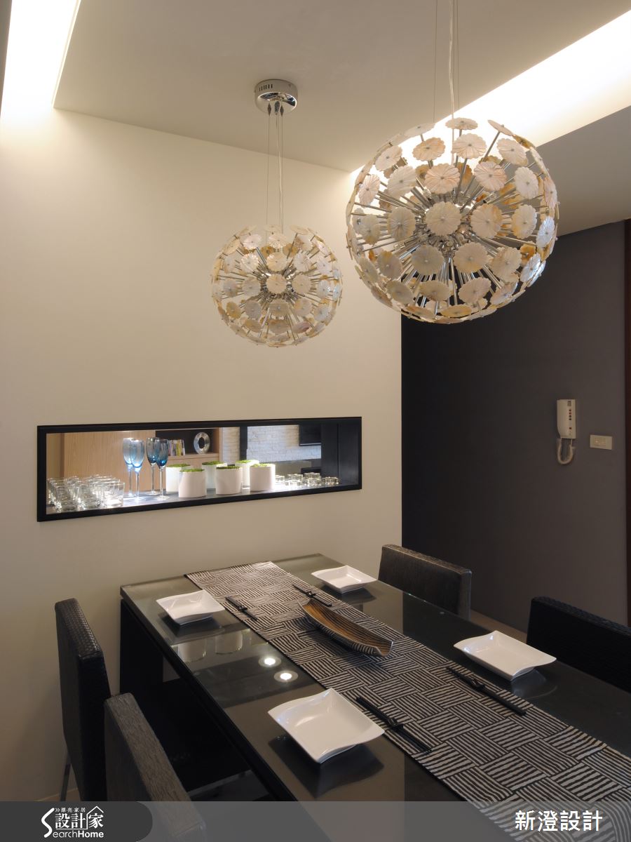 餐廳牆面作出一道內凹展示平台,且內嵌明鏡作為背景,不僅滿足展示機能,更無形中塑造空間延伸的視覺趣味!