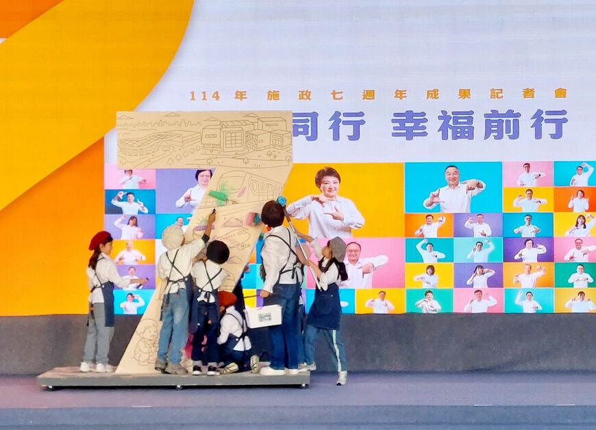 記者會中,特別邀請7位與盧市長2018年上任同一年出生的孩子擔任嘉賓,盧市長與孩子High 5並開心說,「他們7歲,我上任七年!」,孩子與市長一同彩繪台中7年來代表性建設的藝術裝置,象徵「為城市上色」,陪孩子見證台中7年來的成長與變化。