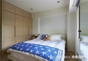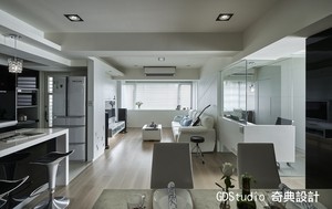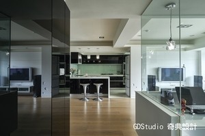 順著設計的節奏,設計師將廚房打掉隔間,利用開放式的吧檯營造出Lounge bar的休閒情懷。電視櫃兩側,也分別設置了隱藏式的CD收納櫃與隔間,不僅使廚房的冰箱能有專屬的擺放空間,更讓整體客廳立面更為開闊簡潔。