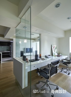 沙發後方,同樣以清透玻璃代替傳統隔間的穿透格局帶出書房,使屋主得以在享受辦公閱讀的樂趣之餘,也能和家中各個角落的成員交流情感。而餐廳廚房的黑色烤漆玻璃,則恰好和客廳的白色空間形成對比,就像琴鍵上一黑一白的衝突美學,將整間住宅,刻劃成最優美時尚的藝術品。