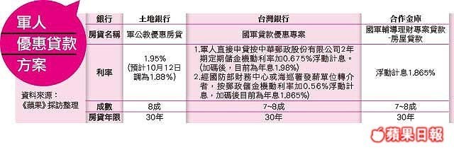 軍人收入穩定,部分銀行推出軍人優惠房貸,利率約1.865%起。范厚民攝