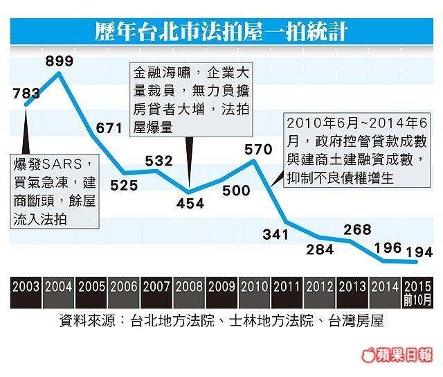 根據台灣房屋智庫統計,台北市成屋進入法拍市場第一拍的數量,在SARS(嚴重急性呼吸系統綜合症)爆發後的2004年、及金融海嘯過後的2010年,達到高峰。