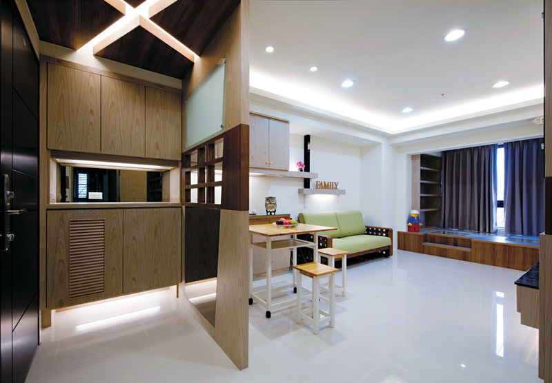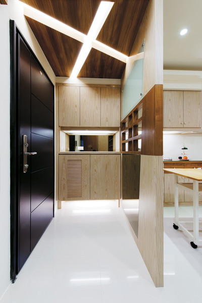 玄關天花透過木作幾何線條,巧妙的圍塑出光影層次,與一旁立面以南方松實木寓意大樹枝枒的茂盛開展,上下映襯出延伸的視覺感受,且透過相片寫真,記載著家人生活的甜蜜回憶…與廳區之間,運用實木局部格狀造型的介質設計,具有功能性、美感及洞悉生活的意趣隱喻。