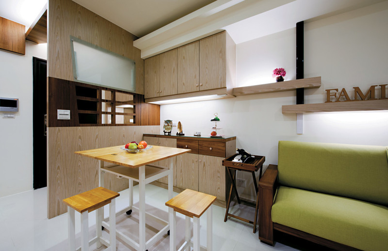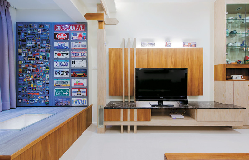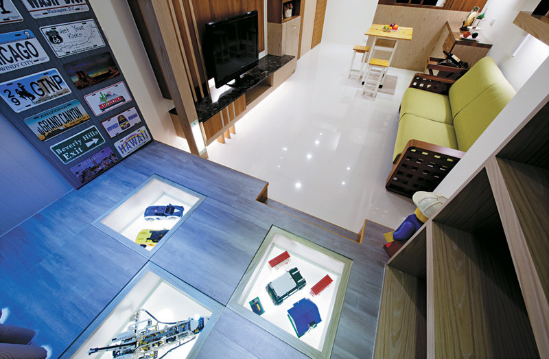 於客廳窗下規劃實木架高的九宮格設計,採局部清玻介面,內藏燈光設計,成為樂高迷的父子倆,最佳收藏及展示作品的區域。一旁立面為男主人從世界各個國家旅行時所收藏車牌,設計雙開櫃體,不僅表面可以懸掛,打開門片內部也可收藏,同時具磁性的安排,方便屋主更換、收納使用。